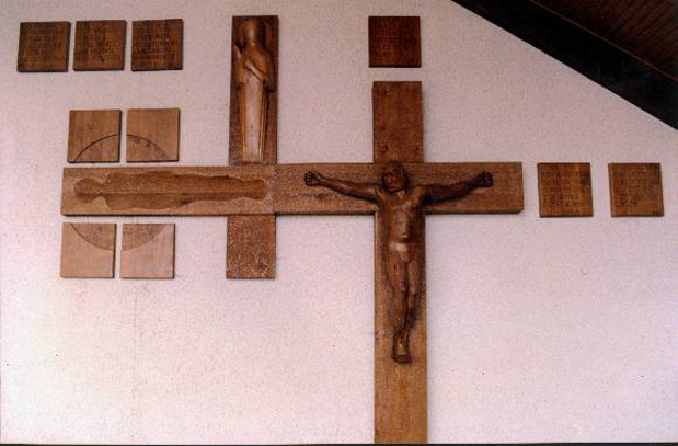 Werkes unterstreicht die Einheit der Dreifaltigkeit in dem Sieg über den Tod. Die Darstellung der Wandskulpturen ist aus den Zeugnissen und Erkenntnissen der Erforschung des Leichentuchs von Turin hervorgegangen. Die Anordnung in a) horizontale und b) vertikale Linien stellt dem Diesseits (dem Menschlichen, der Materie dem Jenseits (das Geistige, die Seele) gegenüber. Die optisch horizontale Linie steht für Statisches, die vertikale für Dynamisches. Die Schrifttafeln sind mit Textauszügen aus der Bibel versehen und unterstützen die Aussage der bildlichen Darstellung. Sie sind von rechts nach links zu lesen: - Die 1. Tafel führt uns zurück an den Anfang der Schöpfung und weist uns zugleich auf Christus hin. („Im Anfang war der Logos und der Logos war bei Gott , und Gott war der Logos!” Ev. Johannes 1:1) Die 2. Tafel bringt das stetige Vorwärtsstreben und nicht Stehenbleiben des Zeitgeschehens zum Ausdruck im Suchen nach Sinn und Ziel des Lebens. („Denn wir haben hier keine bleibende Stadt, sondern die zukünftige suchen wir.” Hebräerbrief 1 3:1 4 ) - Die 3. Tafel repräsentiert die Wahrnehmung der Botschaft, die durch das Leben Christi den Menschen übermittelt werden soll. |